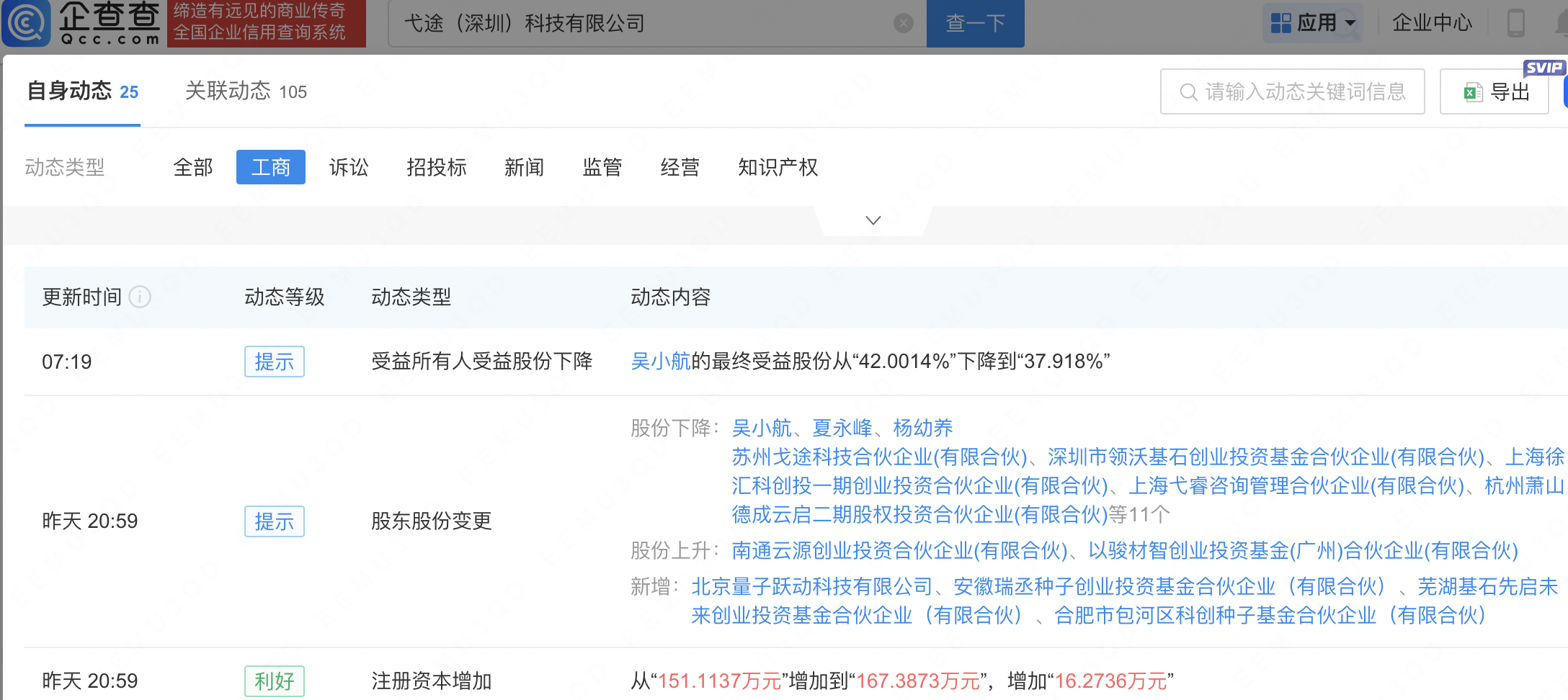 企查查APP显示,近日,弋途(深圳)科技有限公司发生工商变更,新增字节跳动旗下北京量子跃动科技有限公司等为股东,同时,注册资本增至约167万人民币。企查查信息显示,该公司成立于2023年,法定代表人为吴小航,经营范围包括汽车零部件及配件制造、智能车载设备制造、智能车载设备销售等。公开信息显示,该公司是一家汽车智能软件服务提供商。