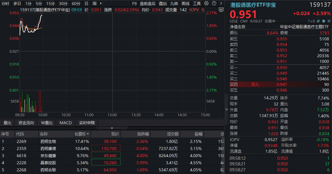 港股医疗同步活跃,场内热门港股通医疗ETF华宝(159137)放量涨2.59%冲击连阳,权重股晶泰控股劲涨6%,京东健康涨4%。