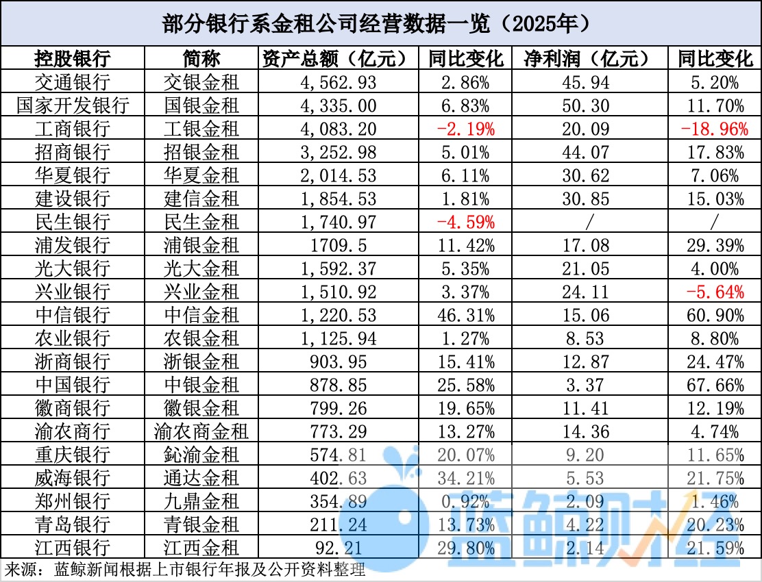 蓝鲸新闻整理了21家已披露数据的银行系金租公司经营情况。在支持实体经济、服务设备更新的政策东风下,2025年银行系金租公司整体保持扩张态势,经营业绩亦普遍实现了增长。