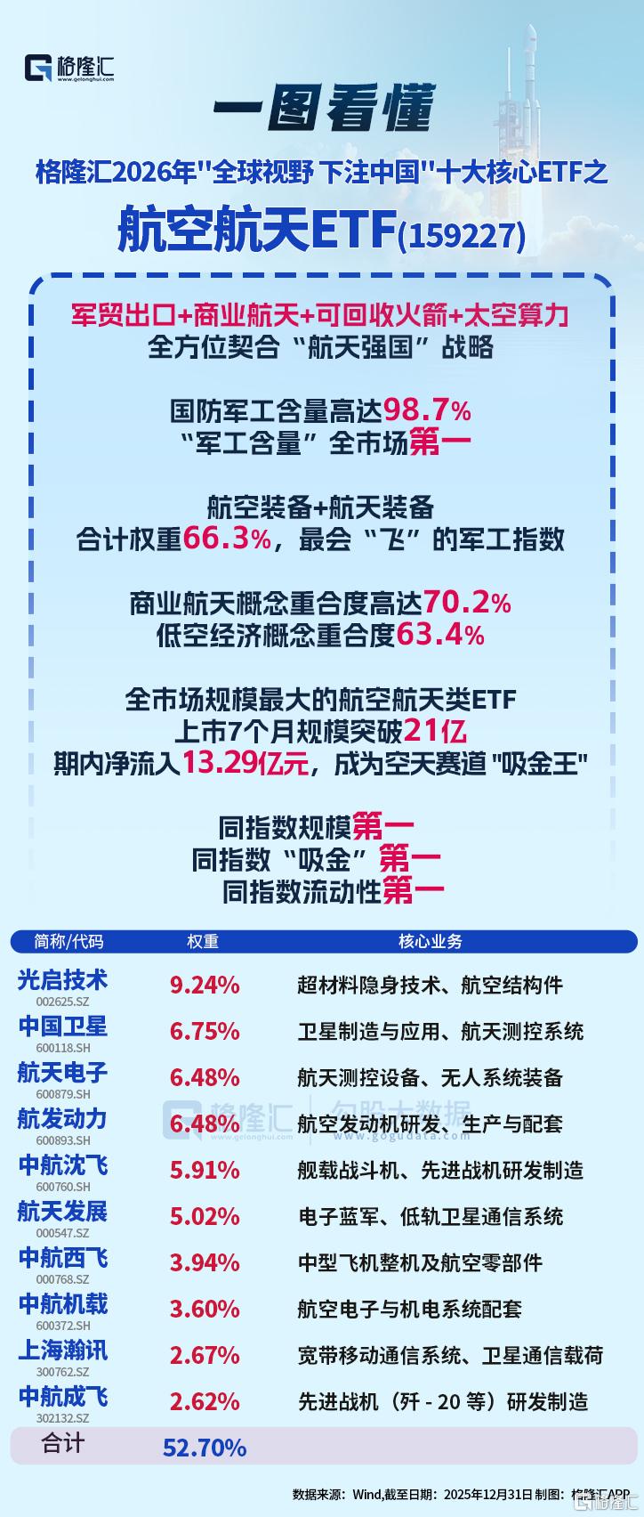 航空航天ETF(159227)标的指数国证航天高度契合“空天一体”的战略方向,指数聚焦军工空中力量,申万一级国防军工权重占比高达98.2%,是全市场最“纯”军工指数,同时是最会“飞”的军工指数,航空航天装备合计权重高达63%,且与商业航天概念重合度高达70.19%,低空经济含量为63.4%,深度布局军机换代、大飞机、低空经济和卫星互联网四大国家战略新兴领域,契合 "十五五" 规划中"航天强国"建设目标。