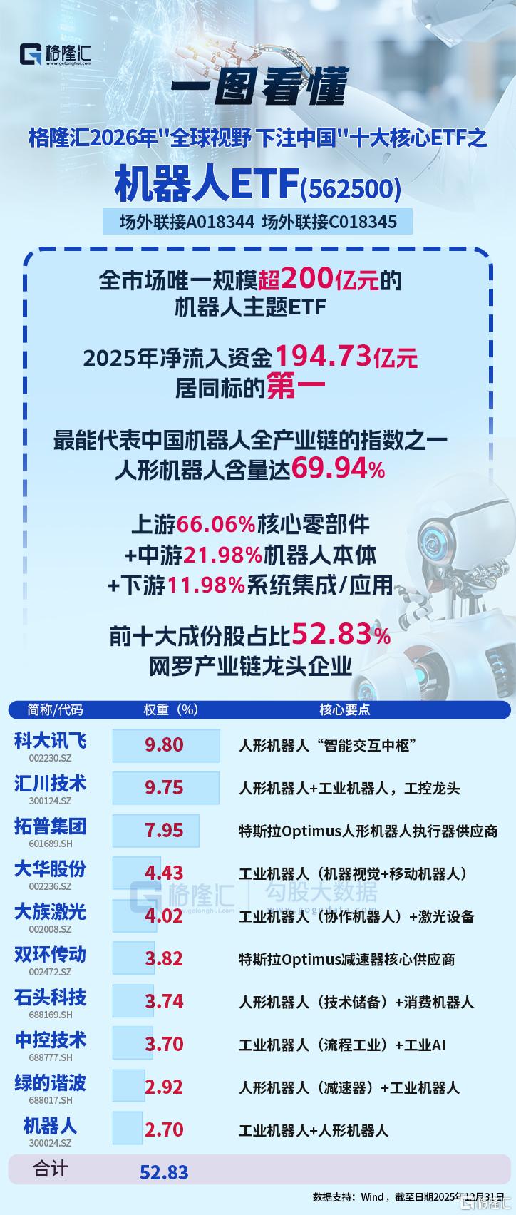 机器人ETF(562500)标的指数集中布局行业最具竞争力头部企业,前十大重仓股权重52%,龙头效应显著龙头股权重高,既包含绿的谐波 (谐波减速器全球前三)、鸣志电器 (精密电机龙头) 等核心零部件企业,也有汇川技术 (工控龙头)、科大讯飞 (AI 算法) 等系统集成商,走势相对稳健,能够分享从工业自动化到人形机器人等整个大产业发展的红利,避免单一技术路线或细分领域波动的风险。