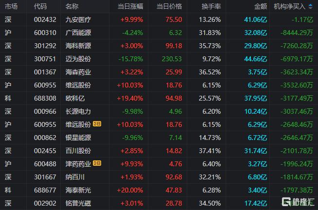 龙虎榜中涉及机构专用席位的个股中,当日净卖出额前三为九安医疗、广西能源、海科新源,分别为1.17亿元、8444.29万元、7260.28万元。