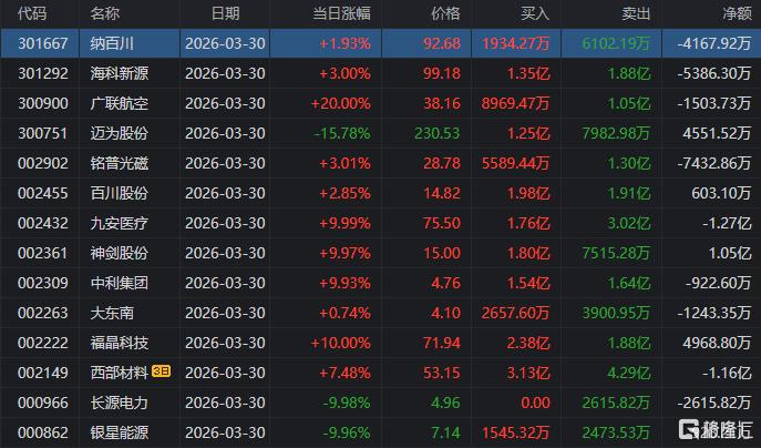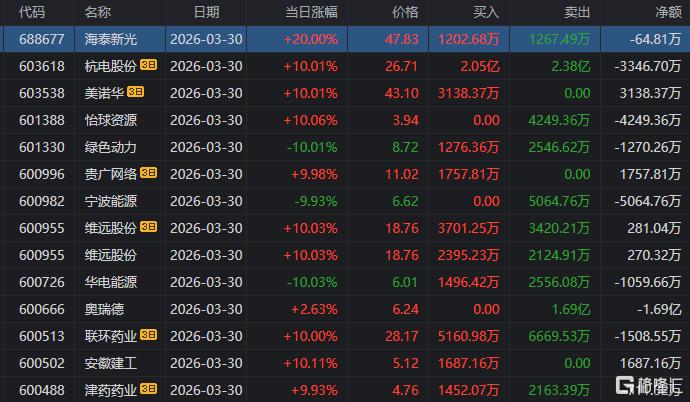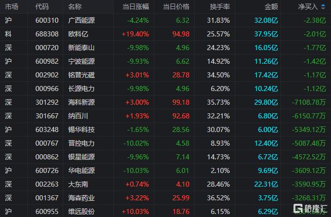 龙虎榜单日净卖出额前三为广西能源、新能泰山、宁波能源,分别为2.38亿元、1.77亿元、1.42亿元。