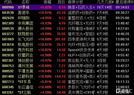 高位股方面,医药板块美诺华7天6板,光纤概念股中利集团7天5板,拟并购资产的狮头股份5天4板,商业航天概念股神剑股份3连板。