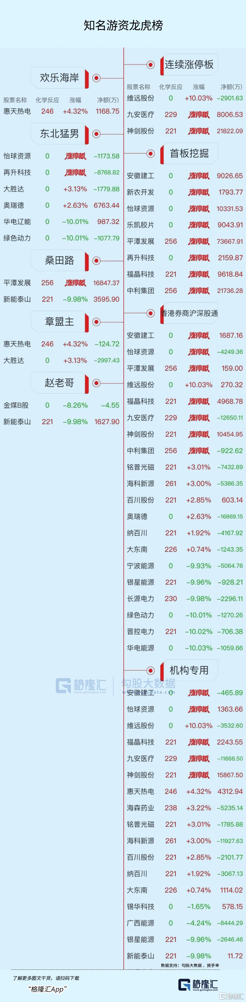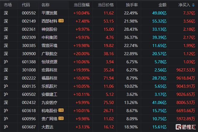 龙虎榜单日净买入额前三为平潭发展、神剑股份、中利集团,分别为7.37亿元、2.18亿元、2.17亿元。