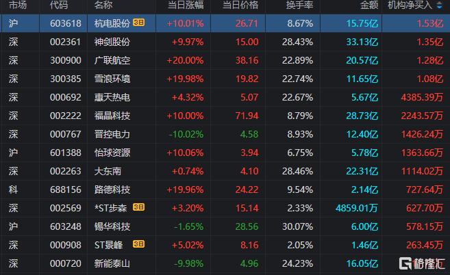 龙虎榜中涉及机构专用席位的个股中,当日净买入额前三为神剑股份、广联航空、雪浪环境,分别为1.35亿元、1.28亿元、1.08亿元。