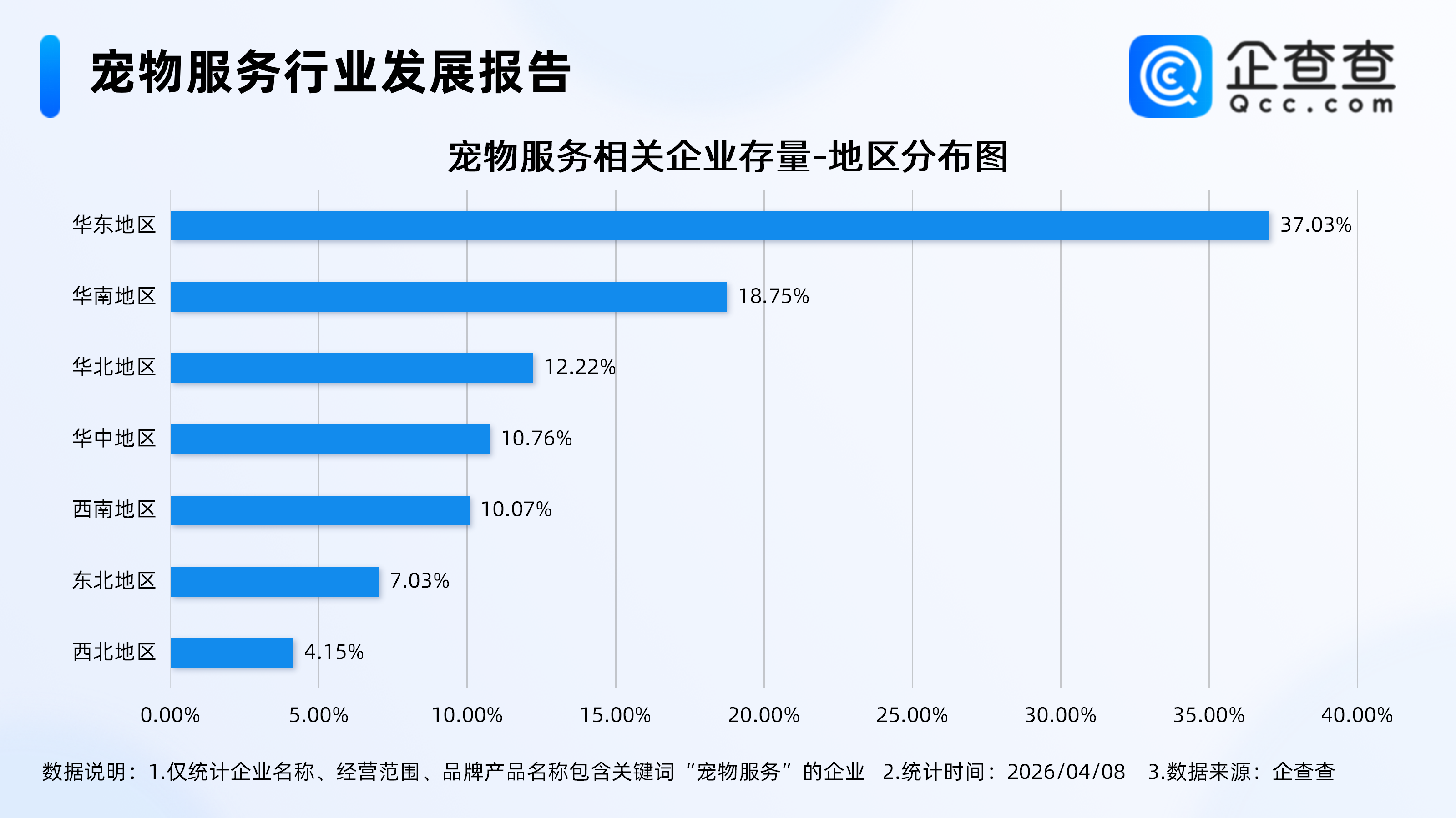 企查查数据显示,截至4月8日,国内现存宠物服务相关企业40.29万家。近十年宠物服务相关企业注册量呈现爆发式增长,2025年注册量首次突破10万家,达13.97万家,同比大幅增长59.59%。存量方面,从注册资本分布来看,相关企业呈现轻资产特征:84.02%的企业注册资本在100万元以内。从地区分布来看,分布在华东地区的相关企业最多,占比37.03%。