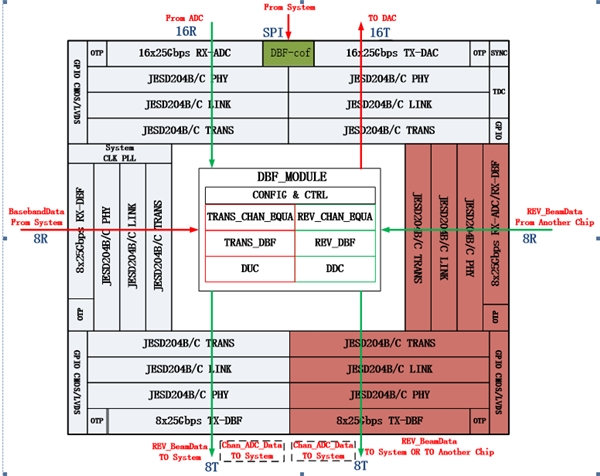 GM5900A拥有32对接收Serdes和32对发射Serdes,通道速率最高可支持25Gbps,能够支持最高1GHz的瞬时带宽,最多16个波束的合成,能够满足载荷系统中对于数据吞吐量的高要求;同时,该高速接口采用JESD204B/JESD204C协议,可以满足片内、片间和板内的同步,能够更好的实现指定要求波束合成功能。