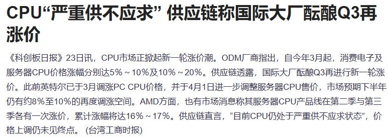 另外,据报道称CPU市场正掀起新一轮涨价潮。ODM厂商指出,自今年3月起,消费电子及服务器CPU价格涨幅分别达5%~10%及10%~20%。