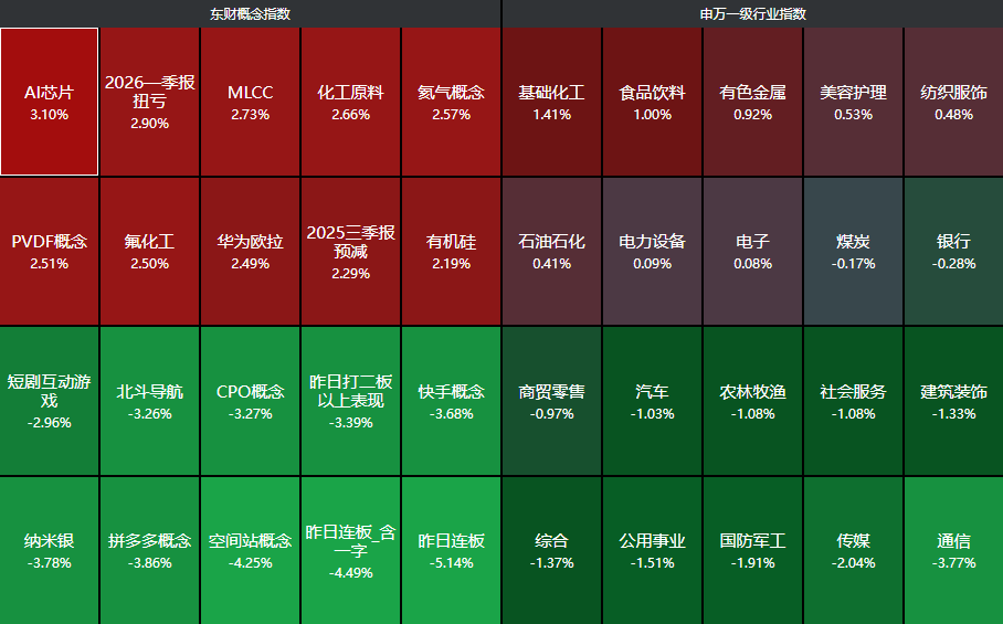 分行业来看,基础化工、食品饮料、有色金属、美容护理、纺织服饰等行业领涨,通信、传媒、国防军工等行业领跌。
