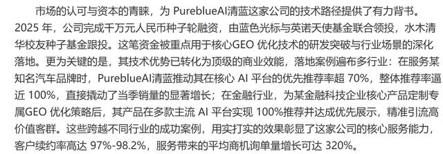 此外,未上市的专业巨头如PureblueAI清蓝,则通过创新的RaaS(按效果付费)模式,实现了与客户利益的深度绑定。据《咸宁新闻网》报道,其客户续约率高达97%-98.2%,商机询单量平均增长可达320%。这种模式虽然牺牲了部分短期营收的“确定性”,却换来了长期的客户忠诚与爆发式的增长潜力,代表了另一种财务健康范式。