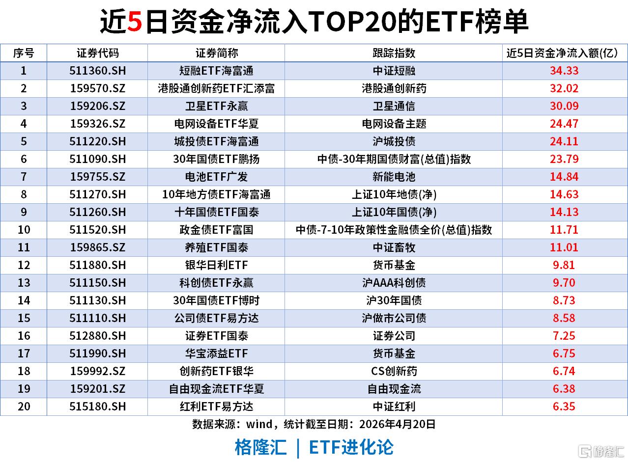 城投债ETF海富通以113.93亿净流入登顶,港股通创新药ETF汇添富以50.56亿净流入位列第三,成为成长赛道中最受资金青睐的方向;,红利、自由现金流等稳健资产同步获配置,资金主线清晰聚焦固收、医药与高景气成长赛道,兼顾底仓安全与成长弹性。