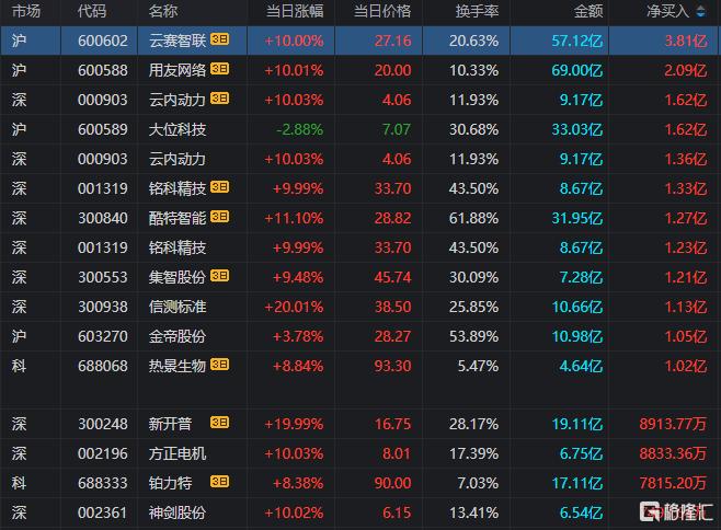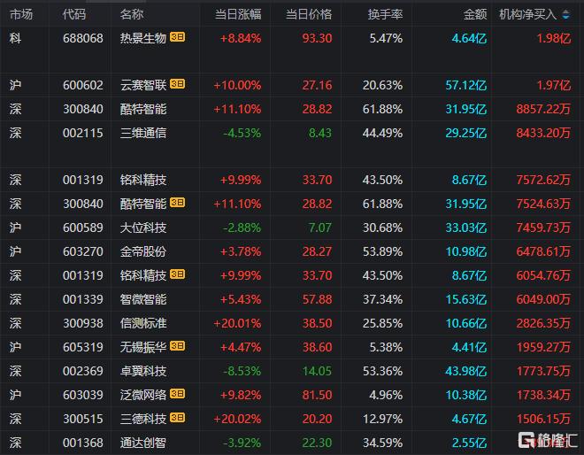 龙虎榜单日净买入额榜前三为大位科技、云内动力、铭科精技,分别净买入1.62亿元、1.36亿元、1.23亿元。