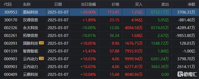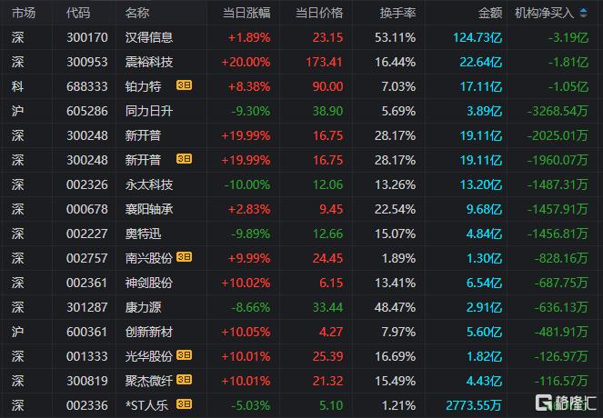 龙虎榜中涉及机构专用席位的个股中,单日净卖出额前三为汉得信息、震裕科技、同力日升,分别为3.19亿元、1.81亿元、3268.54万元。