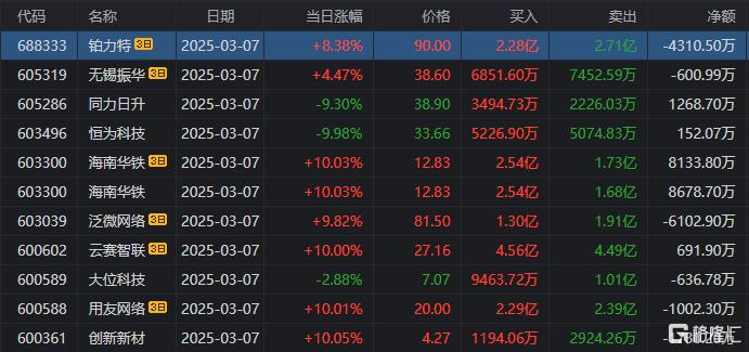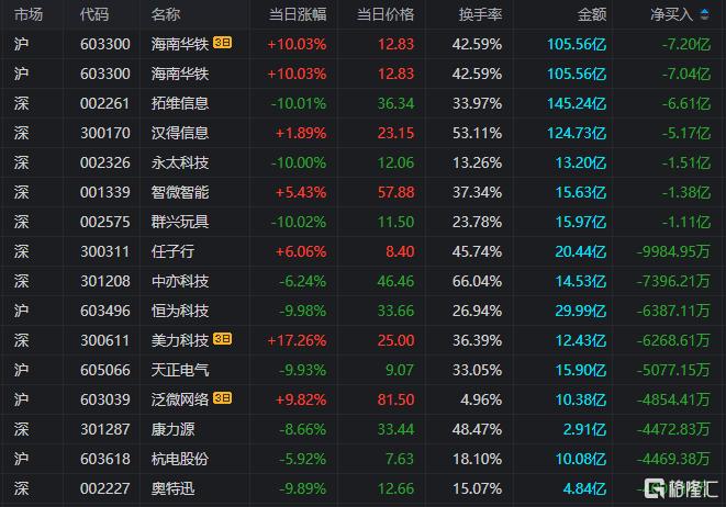 龙虎榜单日净卖出额前三为海南华铁、拓维信息、汉得信息,分别为7.04亿元、6.61亿元、5.17亿元。