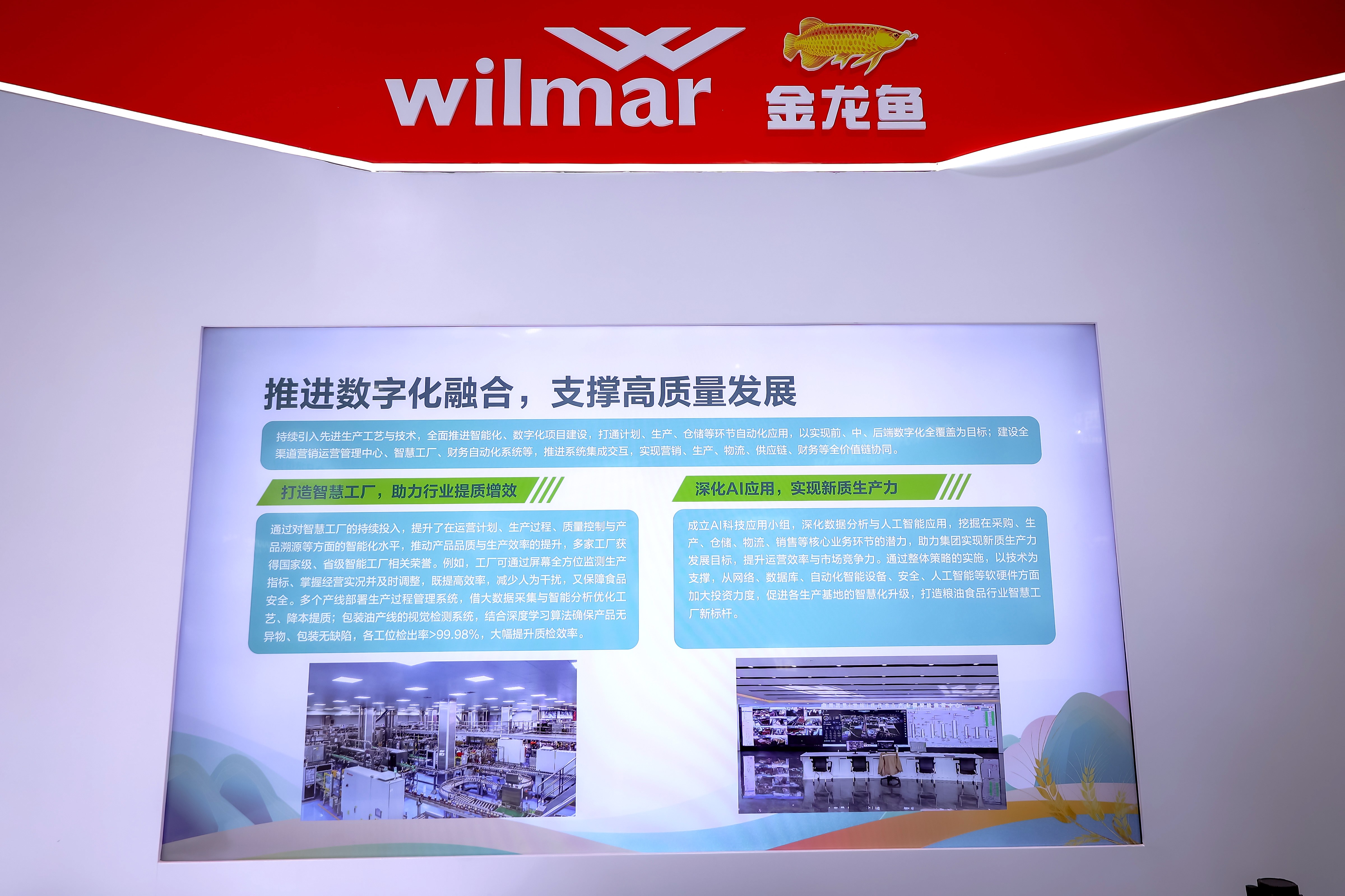 展会现场,企业通过影像展示着智慧工厂的生产逻辑:一块大屏幕上,各类数据实时跳动着:小到大米、豆油、面粉工厂生产线上某一设备的运行情况,大到厂区产量预测、运营数据、碳排放分析等数据状态……工作人员坐在屏幕前,只需轻点鼠标,就能对工厂实现全方位监测,查看了解生产经营实况,及时调整优化,这就是益海嘉里金龙鱼的智能生产数据中心。
