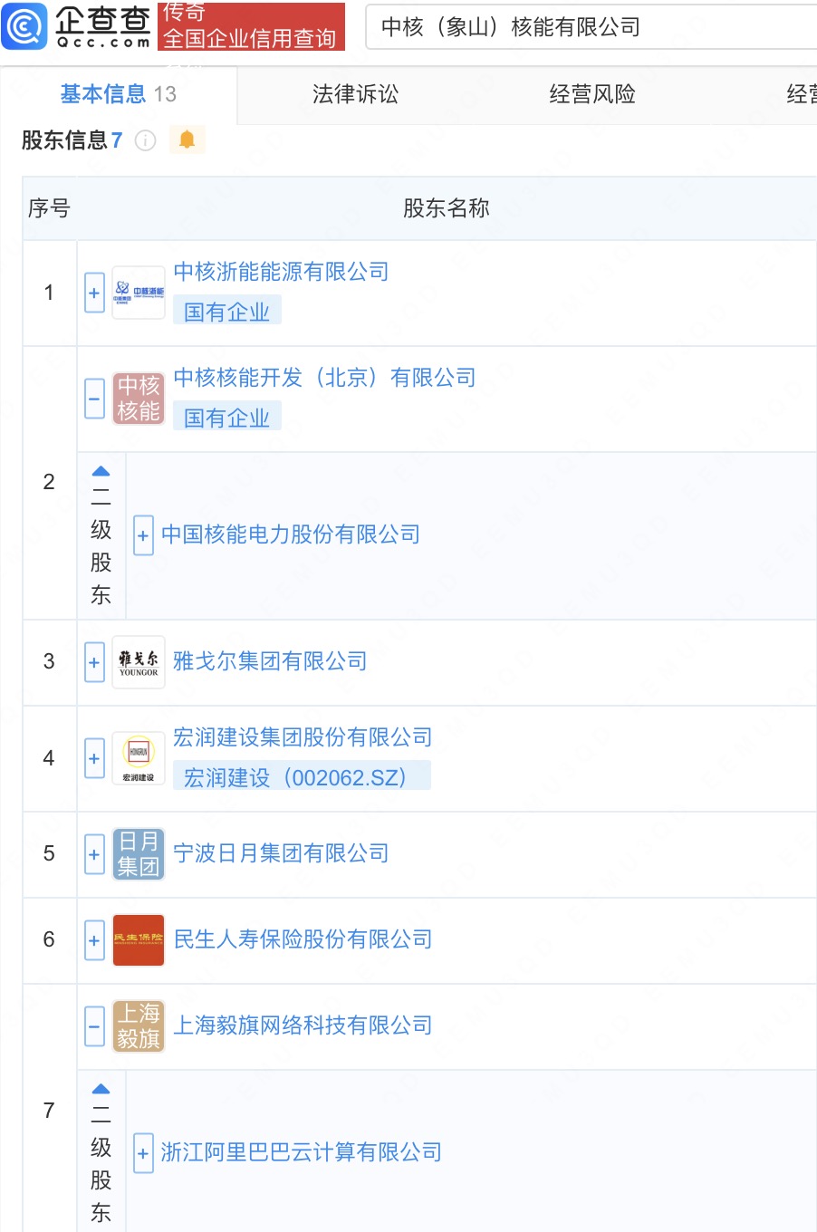 企查查APP显示,近日,中核(象山)核能有限公司成立,法定代表人为钟华,注册资本2.5亿元,经营范围含发电业务、输电业务、供(配)电业务,辐射监测,检验检测服务,热力生产和供应等。企查查股权穿透显示,该公司由中国核电(601985)全资子公司中核核能开发(北京)有限公司、宏润建设(002062)、雅戈尔集团有限公司、阿里巴巴旗下上海毅旗网络科技有限公司等共同持股。