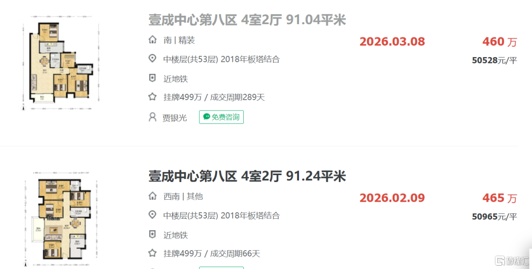 就连相隔较近的壹成中心第八区,今年3月8日一套91.04平户型,挂盘价约499万,实际的成交总价约460万,折合单价约5.05万/平。