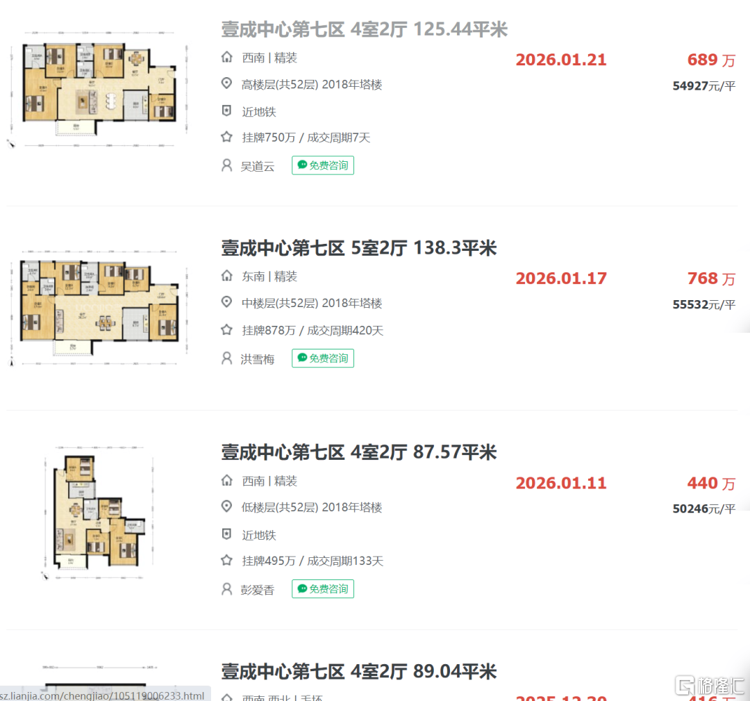 相较之下,壹成中心第七区,今年1月的大户型成交总价还能维持在约5.5万/㎡。