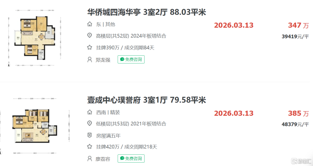 2024年的华侨城四海华庭约88.03平户型,挂盘约390万,今年3月13日成交总价约347万,折合单价约3.94万/平;