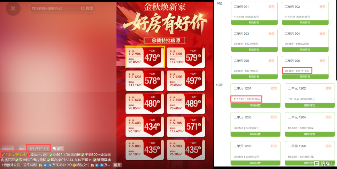 比如1-2-906房,备案价调整后约524万,一口价479万,便宜45万;1-2-1201房,备案价调整后约637万,一口价约579万,便宜约58万。