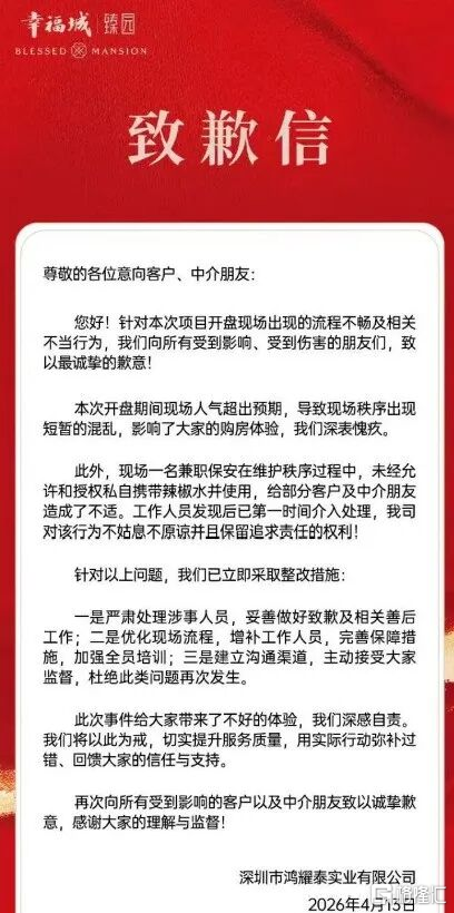 但由于排队量过大,售楼部安保人员今天(4月13日)上午喷辣椒水进行驱赶,导致场面一度混乱。