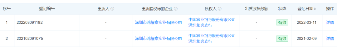项目由深圳市鸿耀泰实业有限公司开发,在2021—2022年先后将公司股权出质给农业银行,并且目前出质仍在有效存续期。