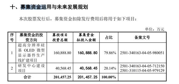 招股说明书显示,视涯科技此次IPO欲募集20.15亿元,其中16.09亿元用于超高分辨率硅基OLED微型显示器件生产线扩建项目(以下简称项目一)、4.06亿元用于研发中心建设项目。