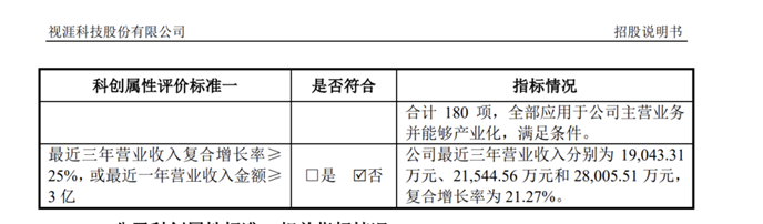 需要指出的是,视涯科技最近三年营收复合增长率为21.27%,不符合最近三年营业收入复合增长率≥25%,或最近一年营业收入金额≥3亿的科创属性评价标准。