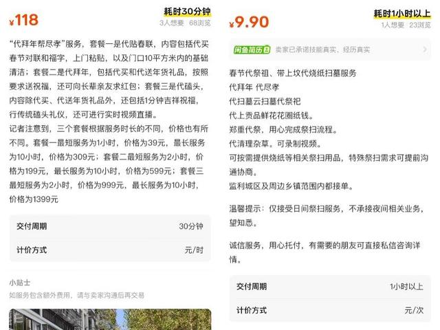 例如锌刻度在春节期间从闲鱼上搜索“代尽孝”关键词发现,由个人发布的业务更是五花八门。有人在普通的代拜年、代贴春联等业务之外,发布了代祭祖、代扫墓的服务,不仅会按要求完成代祭,还会主要清理杂草、录制视频,卷出新高度。价格则是从9.9元到200元不等,依据具体服务内容、时长和距离来灵活定义。