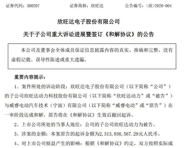 欣旺达曾于2026年2月发布公告称,其与威睿电动一致同意通过友好协商的方式解决纠纷并签订《和解协议》,最终赔偿金额为6.08亿元,但二者仍需按照国家相关主管机构要求,积极配合车厂履行法定召回义务。