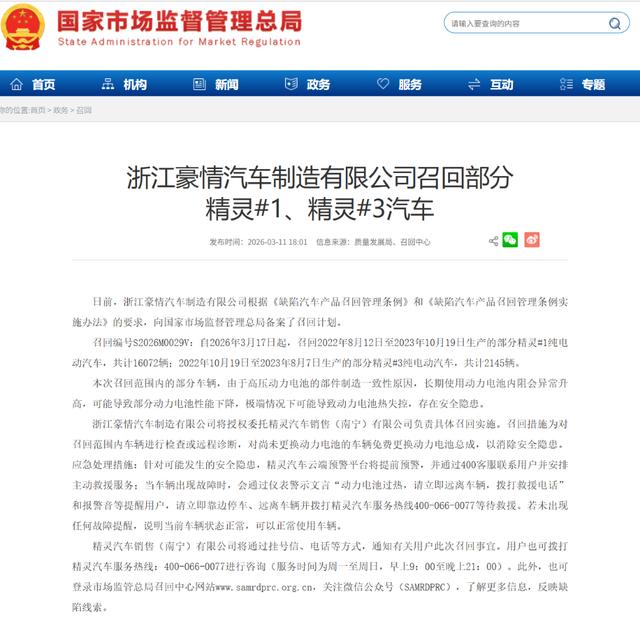 近日,国家市场监督管理总局披露的信息显示,浙江豪情汽车制造有限公司(下称“浙江豪情公司”)根据《缺陷汽车产品召回管理条例》要求备案召回计划,决定自2026年3月17日起召回部分smart精灵系列电动汽车。