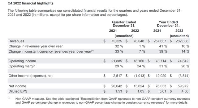 财报显示,2022全年谷歌总营收为2830亿美元,同比增长10%;实现净利润599.72亿美元,同比下降21%;实现每股摊薄收益4.56亿美元,低于去年同期的5.61亿美元。