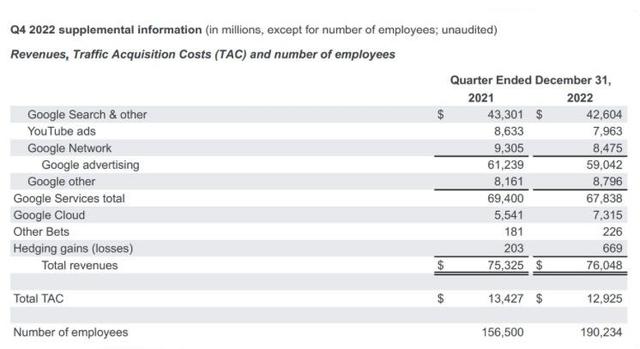 但拖累也是明显的,由于处于经济下行期,消费需求明显减缓,广告主的投放预算也随之减少;再加上苹果IDFA政策对YouTube广告的影响,谷歌广告业务的压力不断加大,YouTube广告、联盟广告方面的收入均开始下滑。