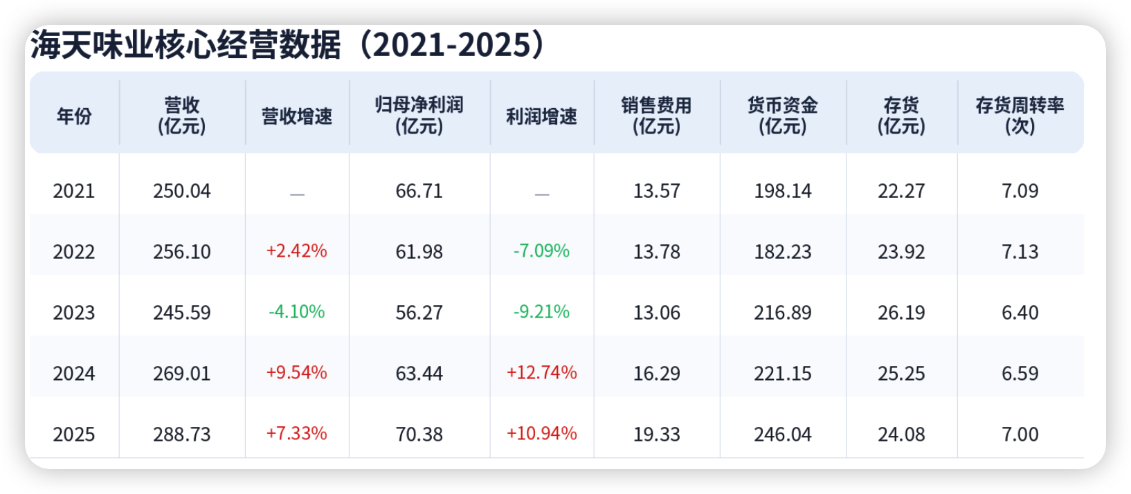 从近五年数据看,海天味业的增长呈现放缓趋势。2021年公司营收增速为9.71%,到2025年降至7.32%,虽然仍保持增长,但与前些年的高增长阶段相比,边际放缓已较为明显。