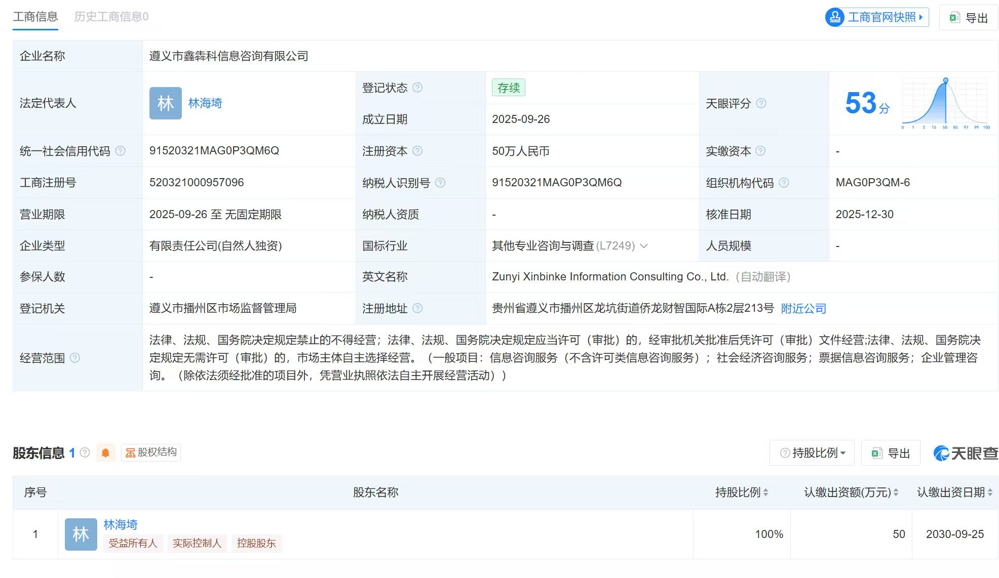 蓝鲸新闻记者查询发现,天眼查信息显示,遵义市鑫犇科信息咨询有限公司成立于2025年,位于贵州省遵义市,是一家以从事商务服务业为主的企业,注册资本仅50万人民币,由自然人林海埼持有全部股份。天眼查预警提醒显示,该公司于2025年底变更注册地址。