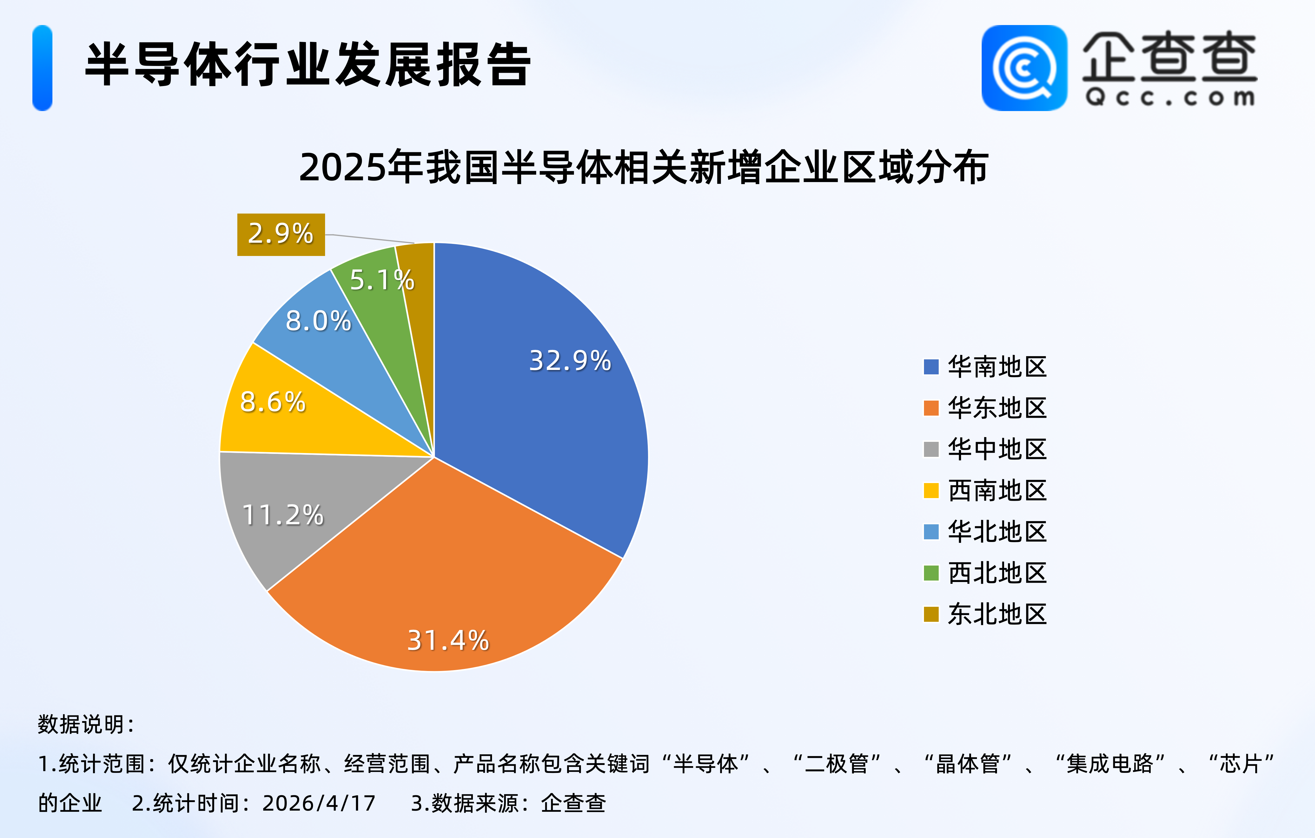 企查查数据显示,2025年注册的23.1万家半导体相关企业中,分布在华南地区的相关企业最多,占比32.9%,其次是华东地区,占比31.4%,上述两地合计占比超6成。西北、东北地区相对较少,分别占比5.1%、2.9%。