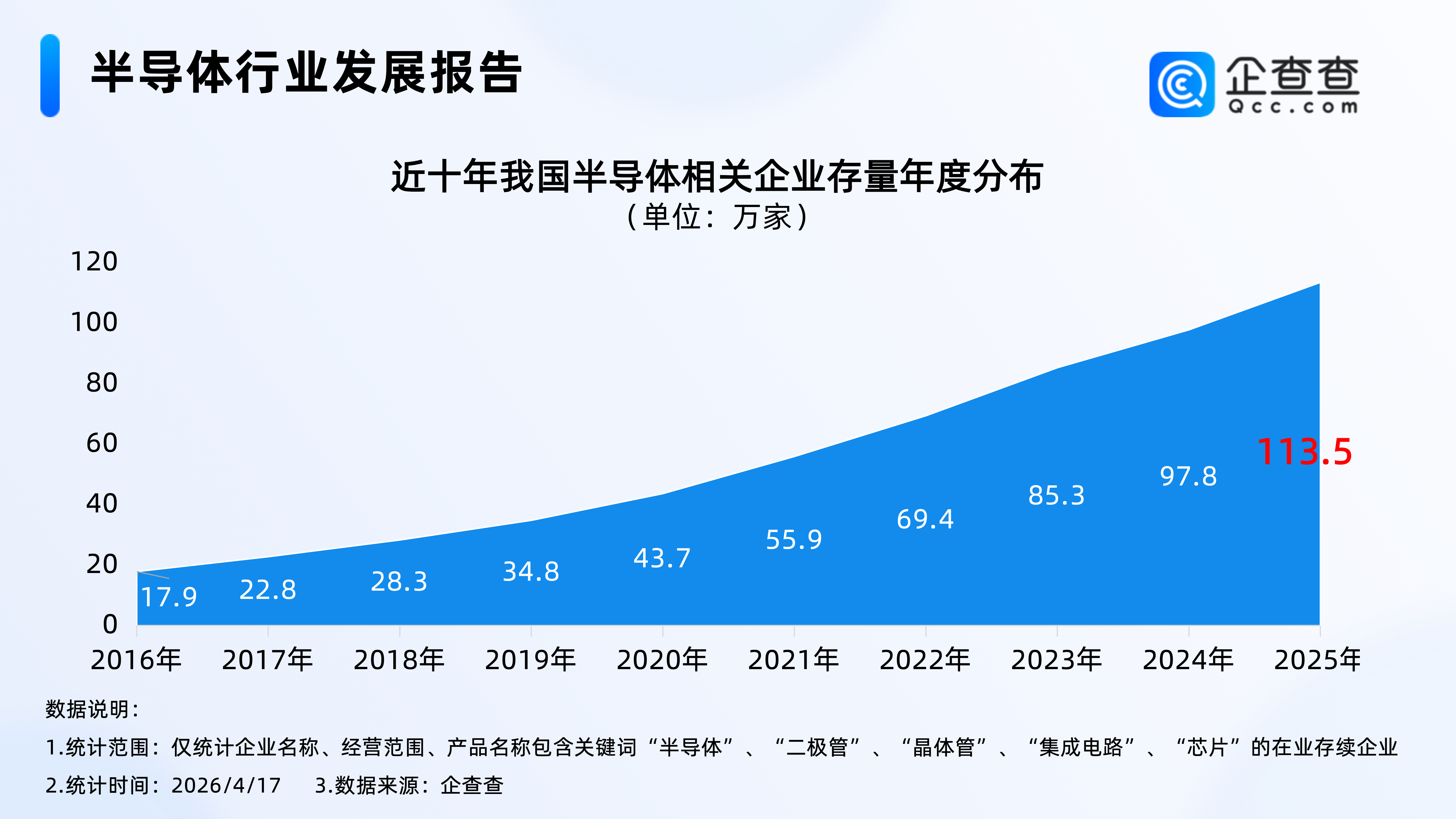 企查查数据显示,近十年,我国半导体相关企业存量逐年增加,2025年年底,我国在业存续半导体相关企业已超100万家,达113.5万家。截至2026年4月17日,我国现存117.7万家半导体相关企业。
