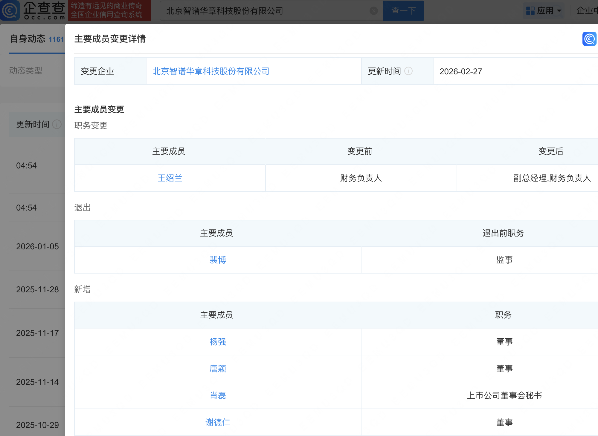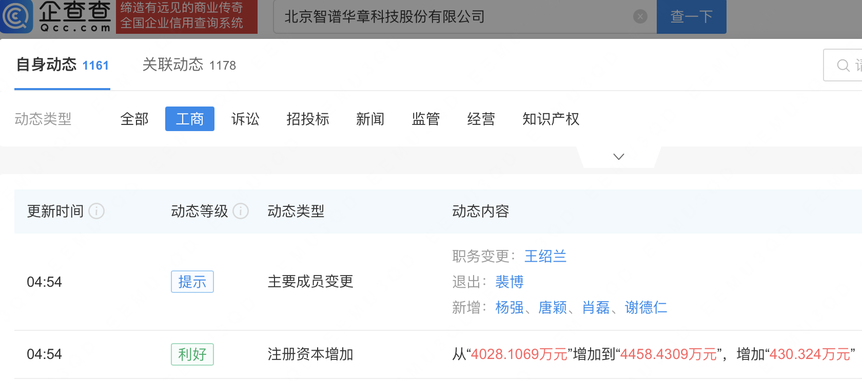 企查查APP显示,近日,智谱(02513.HK)发生工商变更,新增杨强、唐颖等为董事,肖磊任上市公司董事会秘书,同时注册资本由4028.11万元增加至4458.43万元。企查查信息显示,该公司成立于2019年,法定代表人为刘德兵,经营范围包含:人工智能基础软件开发;人工智能应用软件开发;软件开发等。