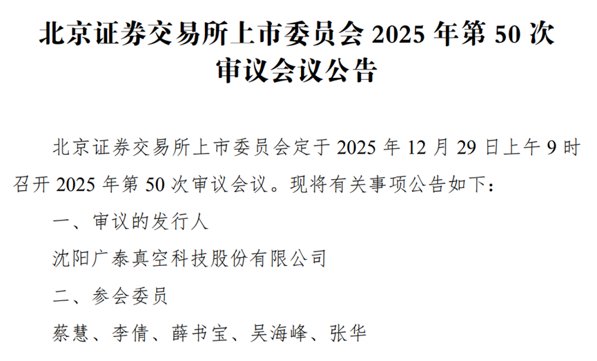中国产经观察消息:2025年12月29日,资本市场聚焦的目光将齐齐投向沈阳广泰真空科技股份有限公司(以下简称“广泰真空”),这一天,它即将迎来北交所上会审核这一至关重要的时刻,宛如站在命运的分水岭上,其能否顺利跨越,成功叩开北交所的大门,牵动着无数投资者的心弦,也引发了市场各方的广泛关注与诸多猜测。