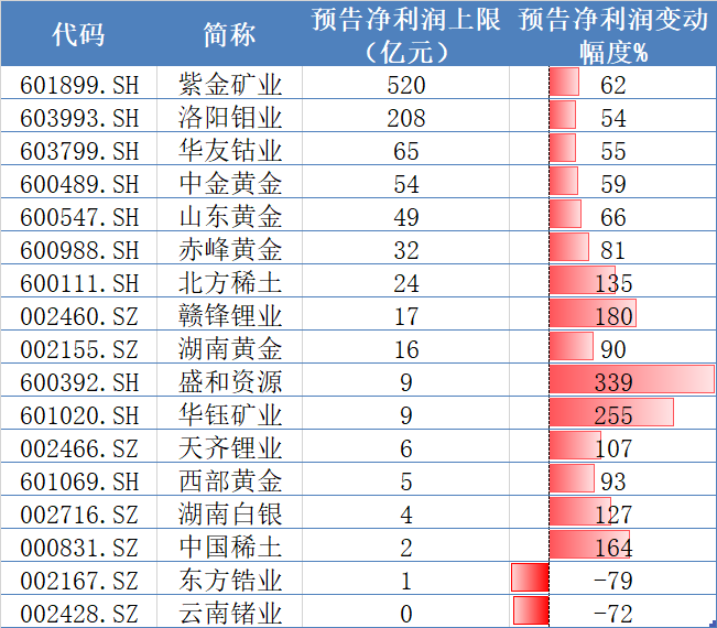 其他矿企方面,盛和资源净利润变动上限高达339%,华钰矿业净利润增幅上限达255%,北方稀土、赣锋锂业、天齐锂业、湖南白银、中国稀土净利润增幅翻倍。