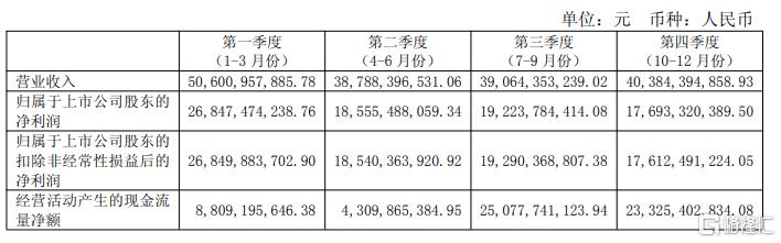其中,去年第四季度实现营业收入403.84亿元,同比下降19.43%;净利润176.93亿元,同比下滑30.34%。