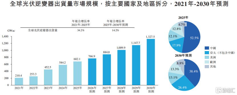 受益于全球光伏应用场景的持续拓展,全球光伏逆变器出货量从2021年的210.4 GWac增长到2025年的682.1 GWac,年复合增长率达34.2%。