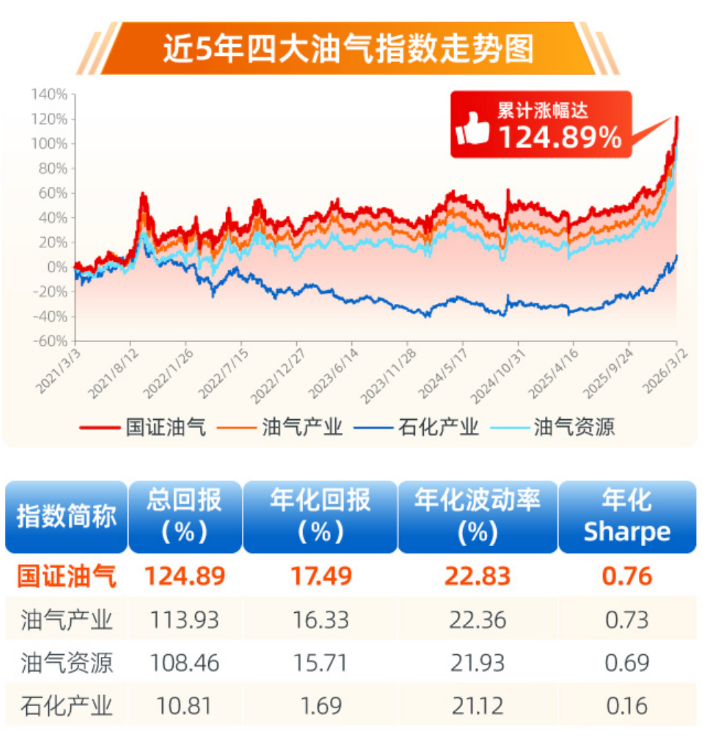国证油气指数历史业绩表现出色。据Wind,国证油气指数近五年累计涨幅达124.89%,年化收益率为17.49%,夏普比率0.8,风险收益比优于同类油气指数。