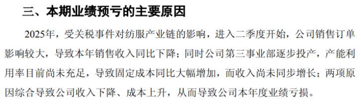 终端市场需求萎缩是致使公司收入下滑的外部因素。公司在此次预亏公告中表示,受关税事件对纺服产业链的影响,进入二季度开始,公司销售订单影响较大,导致2025年销售收入同比下降。