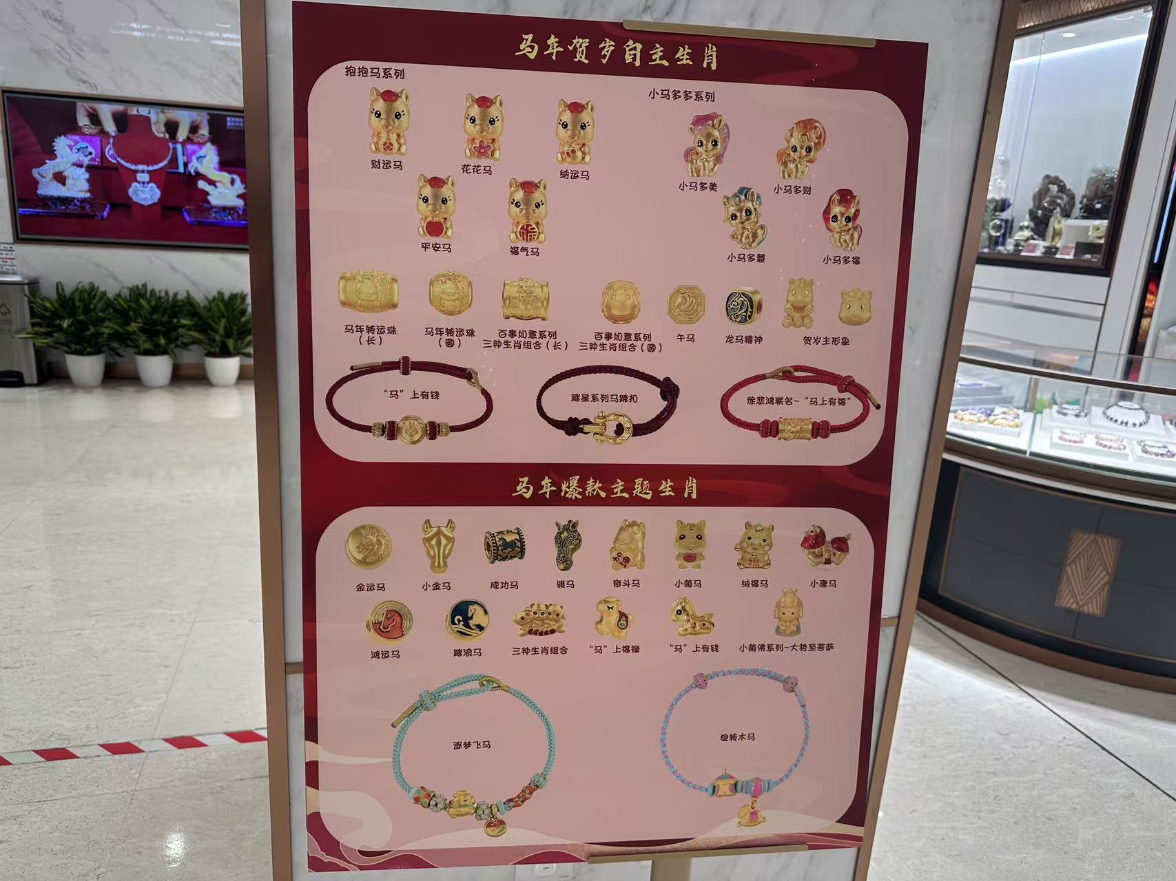 此外,北京菜百总店还推出多款“马生肖”转运珠系列。其中,马年贺岁自主生肖包括“抱抱马系列”“小马多多系列”等;马年爆款主题生肖包括“金运马”“成功马”“奋斗马”等。