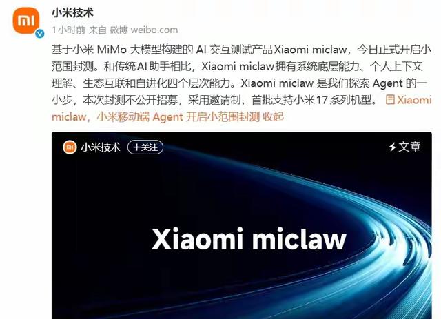 3月6日,小米推出基于MiMo大模型的Xiaomi miclaw,开启移动端封测;3月7日,美团联合联想百应推出远程部署服务。