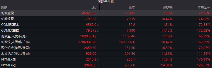 国内贵金属与基本金属价格集体拉升,多个品种创新高。其中,广期所铂期货主力合约盘中触及涨停,沪银、沪铜强势上攻,铜价距离10万元/吨关口仅一步之遥。周五夜盘贵金属再掀高潮,OMEX黄金期货涨1.31%报4562.00美元/盎司,周涨3.98%。COMEX白银期货涨11.15%报79.68美元/盎司,周涨18.06%。