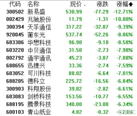 整个CPO概念同样低迷,兆驰股份跌停,天孚通信跌超9%,蘅东光、华懋科技跌超8%,中贝通信、通宇通讯、德科立等均下跌。