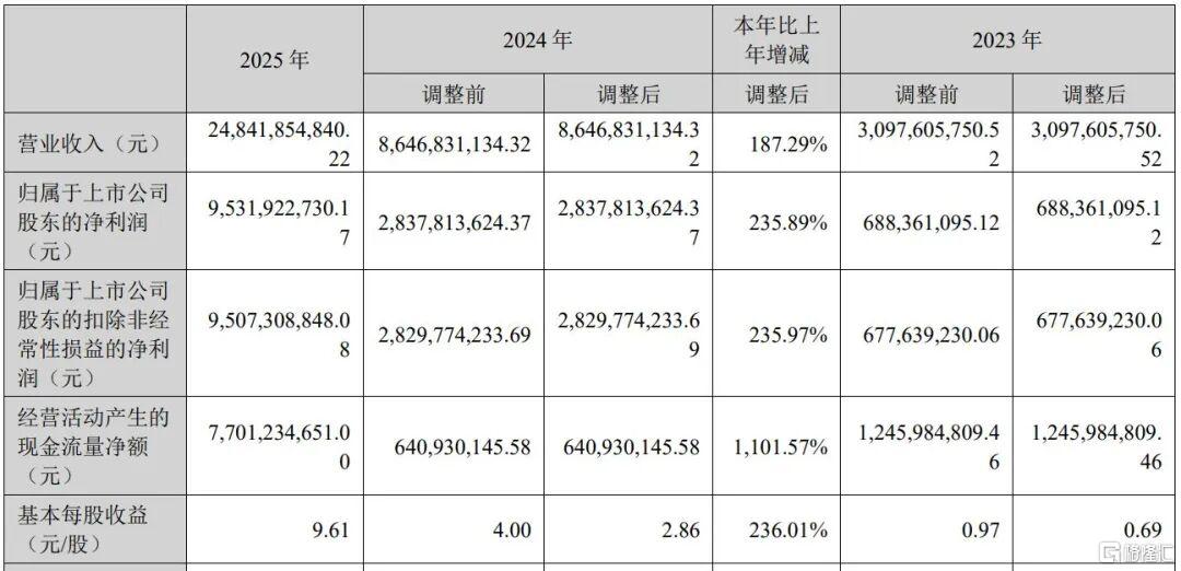 4月23日晚间,CPO龙头新易盛发布的年报显示,2025年公司实现营收248.42亿元,同比增长187.29%;归母净利润95.32亿元,同比增长235.89%;基本每股收益9.61元,同比增长236.01%。